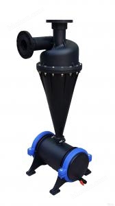離心式過濾器又稱旋流水砂分離器。常見的結(jié)構(gòu)形式有園柱形和園錐形兩種。水砂分離器一般用于含砂量較多得水源。其缺點(diǎn)是不能除去與水比重相近或比水輕的有機(jī)質(zhì)等雜物,特別是水泵起動和停機(jī)時過濾效果下降,會有較多的砂粒進(jìn)入系統(tǒng),因此,水砂分離器只能作為初級過濾,下游還需有篩網(wǎng)過濾器或砂過濾器進(jìn)行******次處理。
