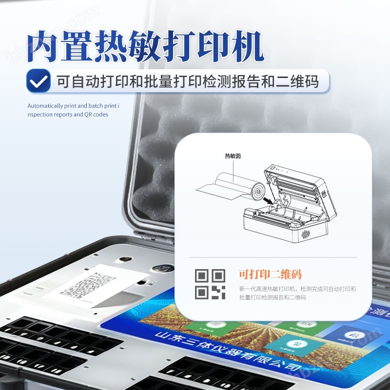 14、內(nèi)置新一代高速熱敏打印機(無需色帶),打印內(nèi)容包含:檢測單位、檢測人員、檢測項目、通道號、吸光度、養(yǎng)分含量(mg/kg)、檢測時間、以及二維碼等信息
