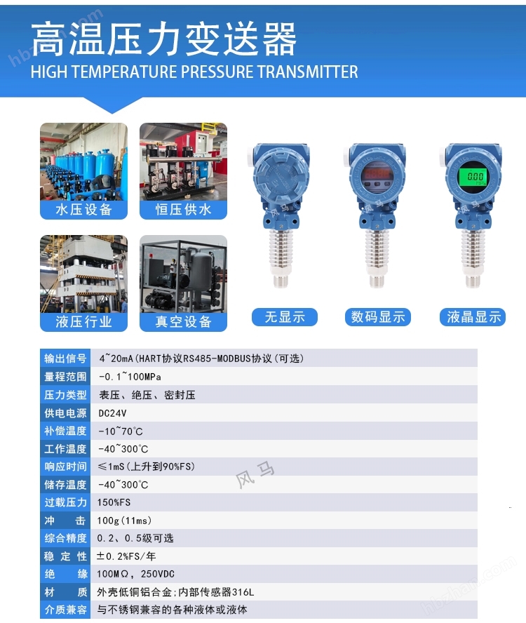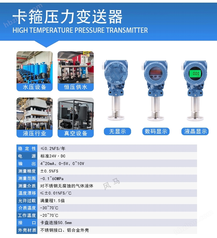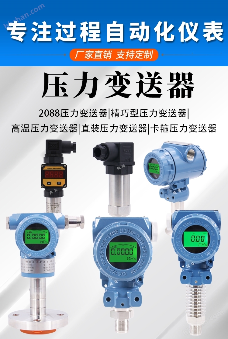 工作原理?:通過擴散硅或電容式傳感器檢測壓力變化,經(jīng)電路處理輸出線性電信號,支持遠程傳輸至PLC或控制系統(tǒng)。?關(guān)鍵性能?: ?量程范圍?:-0.1至60MPa(覆蓋真空到高壓場景)。? ?精度等級?:±0.1%FS(高精度型)至±0.5%FS(標(biāo)準型)。 ?輸出信號?:4-20mA(二線制)、RS485(ModBus協(xié)議)或HART協(xié)議,通信距離達2000米。?環(huán)境適應(yīng)性?:工作溫度-40℃~80℃,防護等級IP65,防爆設(shè)計(ExiaⅡCT6)。??應(yīng)用場景與選型建議 ?工業(yè)領(lǐng)域?: 石油化工:管道壓力監(jiān)控、反應(yīng)釜安全控制。 能源電力:液壓系統(tǒng)、鍋爐蒸汽壓力檢測。??環(huán)保水利:液位測量、污水處理。?? ?選型要點?: 腐蝕性介質(zhì)需選316L不銹鋼膜片(如化工場景)。?高溫環(huán)境(>120℃)推薦電容式傳感器(耐溫達400℃)。需遠程監(jiān)控時優(yōu)先選RS485或HART協(xié)議型號。??088壓力變送器是一種工業(yè)級壓力傳感設(shè)備,通過擴散硅、單晶硅或陶瓷壓阻元件將被測介質(zhì)(液體、氣體、蒸汽)的壓力變化轉(zhuǎn)化為標(biāo)準電信號輸出。其核心機制為:壓力作用于感壓膜片,引起惠斯登電橋電阻變化,經(jīng)ASIC電路進行溫度補償、線性化處理后,輸出?4~20mA?兩線制電流信號,或支持?HART、Modbus RS485?等數(shù)字協(xié)議,實現(xiàn)遠程監(jiān)控與自動化集成。2088系列壓力變送器廣泛應(yīng)用于以下工業(yè)領(lǐng)域:石油化工?:管道壓力監(jiān)控、儲罐液位測量 水處理與恒壓供水?:泵站壓力閉環(huán)控制 電力與熱力?:蒸汽壓力監(jiān)測、鍋爐安全控制? 食品制藥?:衛(wèi)生型