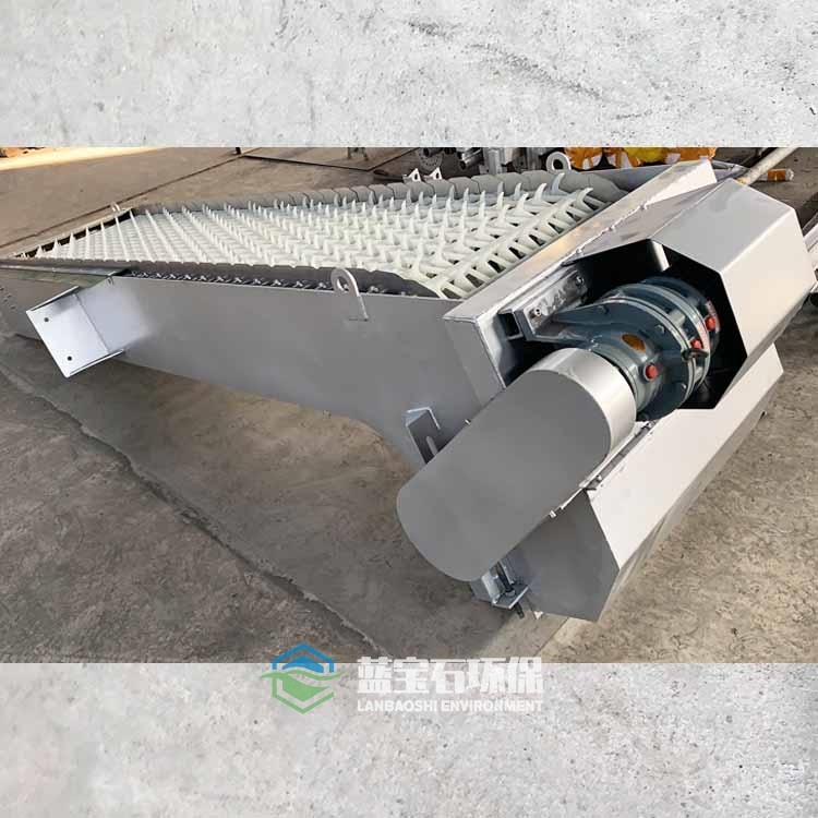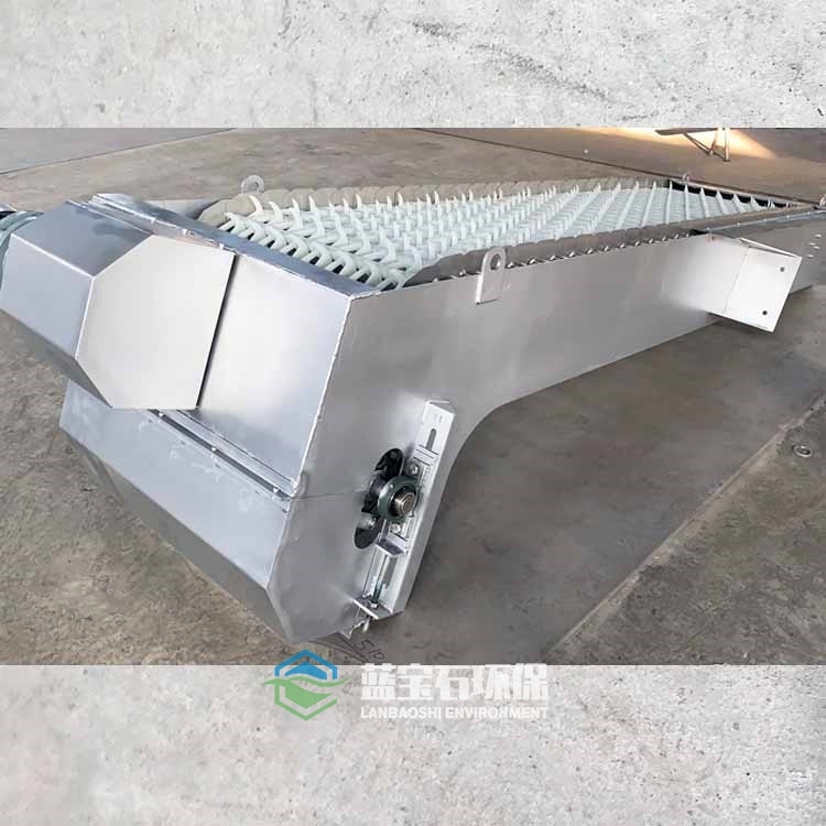 耙齒鏈運(yùn)轉(zhuǎn)到設(shè)備的上部時(shí),由于槽輪和彎軌的導(dǎo)向,使每組耙齒之間產(chǎn)生相對(duì)自清運(yùn) 動(dòng),絕大部分固體物質(zhì)靠重力落下。另一部分則依靠清掃器的反向運(yùn)動(dòng)把粘在耙齒上的雜物清掃干凈。