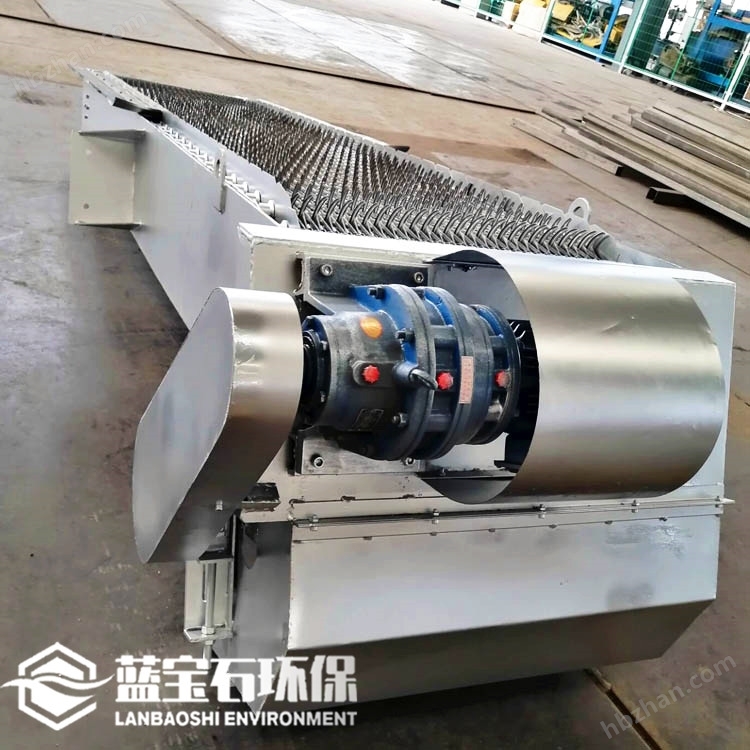 回轉(zhuǎn)式機(jī)械格柵除污機(jī)工作原理 回轉(zhuǎn)式機(jī)械格柵是由一種特別的耙齒裝配成一組回轉(zhuǎn)格柵鏈。在電機(jī)減速器的驅(qū)動(dòng)下,耙齒鏈進(jìn)行逆水流方向回轉(zhuǎn)運(yùn)動(dòng),將漂浮在水面上的浮渣打撈,耙齒鏈運(yùn)轉(zhuǎn)到設(shè)備的上部時(shí),由于槽輪和彎軌的導(dǎo)向,使每組耙齒之間產(chǎn)生相對(duì)自清運(yùn)動(dòng),絕大部分固體物質(zhì)靠重力落下。另一部分則依靠清掃器的反向運(yùn)動(dòng)把粘在耙齒上的雜物清掃干凈。按水流方向耙齒鏈類同于格柵,在耙齒鏈軸上裝配的耙齒間隙可以根據(jù)使用條件進(jìn)行選擇。當(dāng)耙齒把流體中的固態(tài)懸浮物分離后可以保證水流暢通流過。整個(gè)工作過程是連續(xù)的,也可以是間歇的。