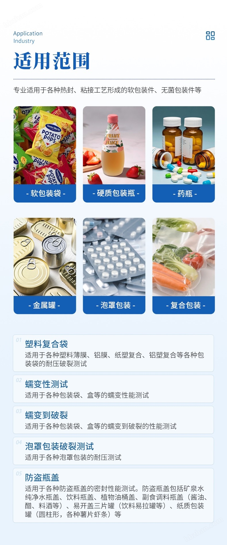 | 泡罩包裝破裂測試 | 適用于各種泡罩包裝的耐壓測試 |